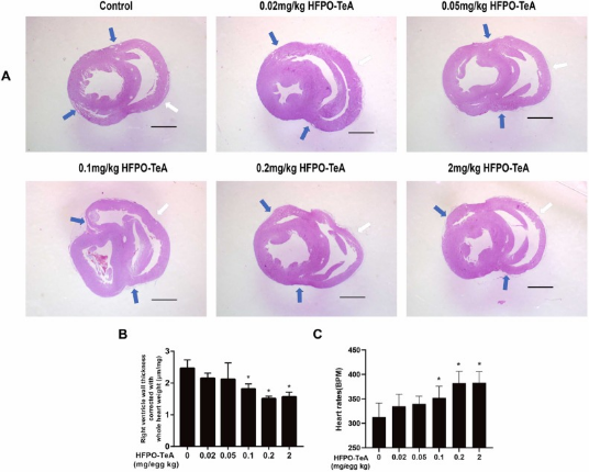 由公共卫生学院本科生、研究生共同组成的研究团队对HFPO-TeA潜在的发育毒性与机制进行了研究,发现HFPO-TeA发育暴露后,鸡胚出现发育心脏毒性和发育肝脏毒性,具体表现为右心室壁变薄、心率加快和肝脂肪变性。通过慢病毒胚胎微注射注射实现PPARα在体沉默后,观察到上述毒性的缓解。Western blotting结果表明,HFPO-TeA的发育暴露显著增加了雏鸡心脏和肝脏组织样品中PPARα下游分子EHHADH和FABPs的表达水平,而PPARα沉默有效地阻止了这种变化,这表明PPARα及其下游基因在HFPO-TeA诱导的发育毒性中发挥着重要作用。