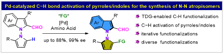 过去几十年,轴手性化学迎来快速发展,一系列具有C-C或C-N轴的轴手性骨架相继被发现并实现其不对称合成。然而,与之相对应的N-N轴手性长期以来一直没有引起化学家的重视。过渡金属催化不对称C−H官能团化是构建手性分子的重要策略之一,通过采用廉价易得的氨基酸作为瞬态辅基(TDG)策略来实现醛的不对称C-H活化,成为近年来最为成功的C-H活化策略之一。然而,目前该策略对于吡咯C−H键官能化构建轴手性化合物仍然是一个挑战。近日,化学化工学院刘人荣团队通过TDG策略实现了钯催化吡咯2位C−H官能团化构建N-N轴手性,为N-N轴手性构建提供了一条新的高效路径。