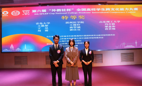 山东赛区比赛吸引了全省50多所院校的463个团队报名参加。通过初赛阶段的校级选拔,50个参赛团队参加省级复赛。复赛的比赛内容是跨文化交际案例的开发与展析,考察参赛选手对于跨文化交际中文化冲突的展示和解决问题的能力。鸭脖参赛团队以复赛第一名的成绩晋级决赛。鸭脖三名参赛同学在决赛中努力拼搏,凭借出色的语言水平、创新能力和合作精神,得到了评委嘉宾的一致认可,最终取得决赛第一名,获得山东赛区特等奖,将于今年11月赴湖南参加全国赛。