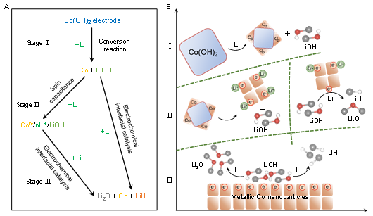 为了揭示这一关键科学问题,该工作对典型的Co(OH)2/Li电池体系进行了深入研究,并取得了重要进展。结合微观电镜、光谱分析、磁性测试和密度泛函理论计算阐明了Co基电极材料中涉及自旋极化电子转移的电化学界面催化反应全过程(上图),揭示了电化学驱动演化过程中的局部化学、电子结构,以及它们与电化学性能的联系。以Co(OH)2为模型电极,监测不同施加电压下的Co金属中心。结果发现在典型的界面催化反应进行之前,由于自旋极化电子的注入,金属Co纳米颗粒/LiOH界面处首先出现自旋极化表面电容并存储界面电荷。随后,金属Co纳米颗粒作为催化活化中心,会转移这些贮存的电子以促进LiOH分解。有趣的是,在LiOH分解电位下,反应过程中涉及电子的转移导致金属Co纳米粒子的电子结构呈现出周期性动态变化。这项工作提供了一种可行的方法来获取界面催化过程中的关键信息,并为监测更广泛电化学系统中的复杂界面提供了有力的工具。此外通过建立电极动态结构演变与电化学性能之间的联系来帮助优化界面催化剂,可以为构建下一代能源系统开辟一条新的途径。