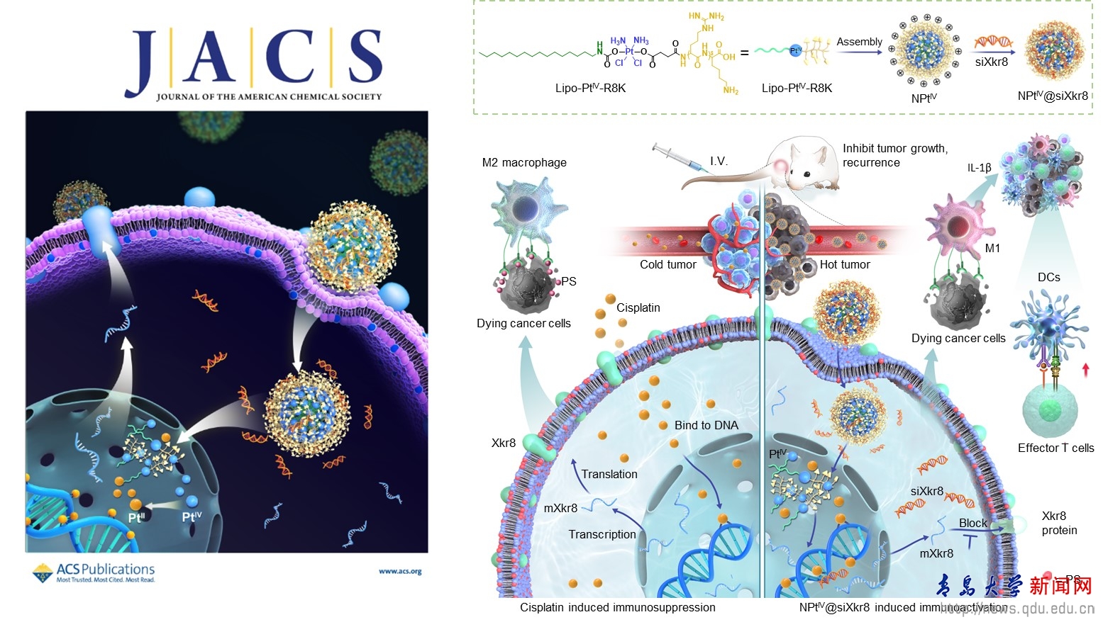 新闻网讯 近日,鸭脖药学院孙勇教授和中国科学院化学研究所肖海华研究员合作,在铂药核靶递送和免疫增强研究方面取得最新研究进展。相关研究成果近期以“Nuclear-Targeting Lipid PtIVProdrug Amphiphile Cooperates with siRNA for Enhanced Cancer Immunochemotherapy by Amplifying Pt-DNA Adducts and Reducing Phosphatidylserine Exposure”为题发表在Journal of the American Chemical Society(JACS,DOI:10.1021/jacs.3c12706)作为封面文章。本文第一作者为YABO鸭脖药学院青年教师魏登帅,通讯作者为孙勇教授和肖海华研究员。