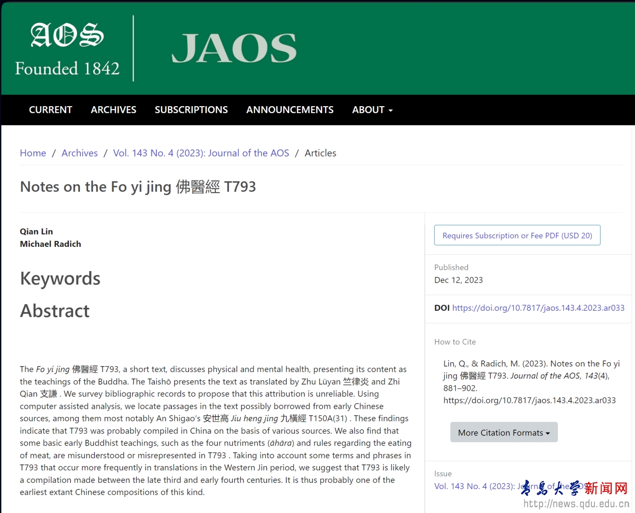 新闻网讯 近日,历史学院林倩副教授和德国海德堡大学何书群(MichaelRadich)教授的合作研究成果在美国东方学会会刊Journal of theAmericanOrientalSociety上发表,题为“Notes on the Fo yi jing佛醫經T793”。Journal of theAmericanOrientalSociety是北美历史最悠久的亚洲学术研究期刊,是世界上最负盛名亚洲及中国研究的期刊之一,收录于艺术与人文引文索引(A&HCI)。林倩副教授是论文的第一作者,YABO鸭脖为论文的第一署名单位。
