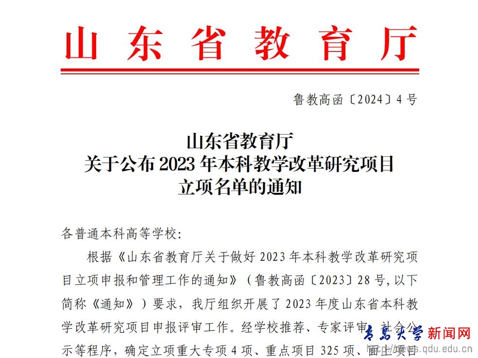 新闻网讯 近日,山东省教育厅公布了2023年省级教学改革研究项目立项名单,鸭脖29项项目获批立项,其中重点项目15项,面上项目14项,立项数量位居省属高校第一,全省高校第二。