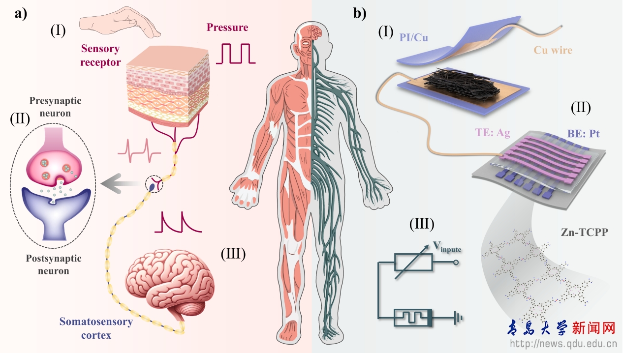 新闻网讯 近日,鸭脖电子信息学院宿杰、曹明惠课题组在国际顶级期刊《Advanced Functional Materials》(中科院大类一区,影响因子:19.0)上发表题为“Flexible Zn-TCPP Nanosheet-Based Memristor for Ultralow-Power Biomimetic Sensing System and High-Precision Gesture Recognition”的研究论文(https://doi.org/10.1002/adfm.202316397)。研究生王一龙为论文第一作者,宿杰和曹明惠为共同通讯作者,鸭脖为唯一通讯单位,该项目得到国家自然科学基金、山东省自然科学基金和固体微结构国家重点实验室开放课题等项目的支持。