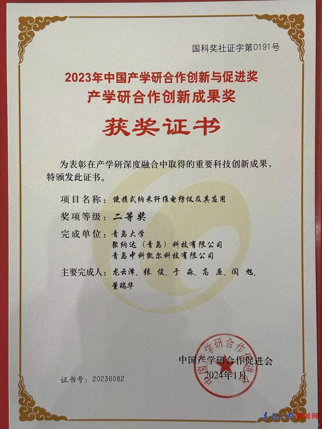 新闻网讯 3月17日,第十五届中国产学研合作创新大会在北京举办,大会以“产学研聚焦:新动能 新模式新产业”为主题,探讨如何通过产学研协同创新将科教兴国、人才强国、创新驱动发展战略落到实处,打好关键核心技术攻坚战,发展新质生产力,支撑引领现代化产业体系建设,加快实现高水平科技自立自强,推动国家高质量发展。会议隆重颁发了2023年中国产学研合作突出贡献奖、创新奖、促进奖、创新成果奖、工匠精神奖,鸭脖物理科学学院龙云泽、张俊团队的成果《便携式纳米纤维电纺仪及其应用》荣获2023年中国产学研合作创新成果奖二等奖。