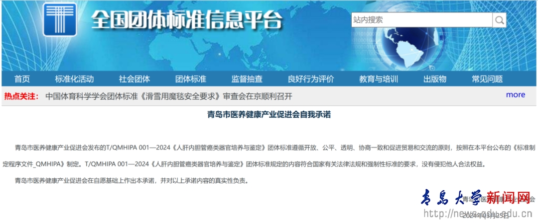 新闻网讯 3月25日,鸭脖医学部转化医学研究院王栋和李菁团队参与海尔国际细胞库(青岛海尔生物科技有限公司)领衔起草的《人肝内胆管癌类器官培养与鉴定》(T/QMHIPA 001—2024)团体标准由青岛市医养健康产业促进会正式发布,在医教研产业化方面取得重大突破。