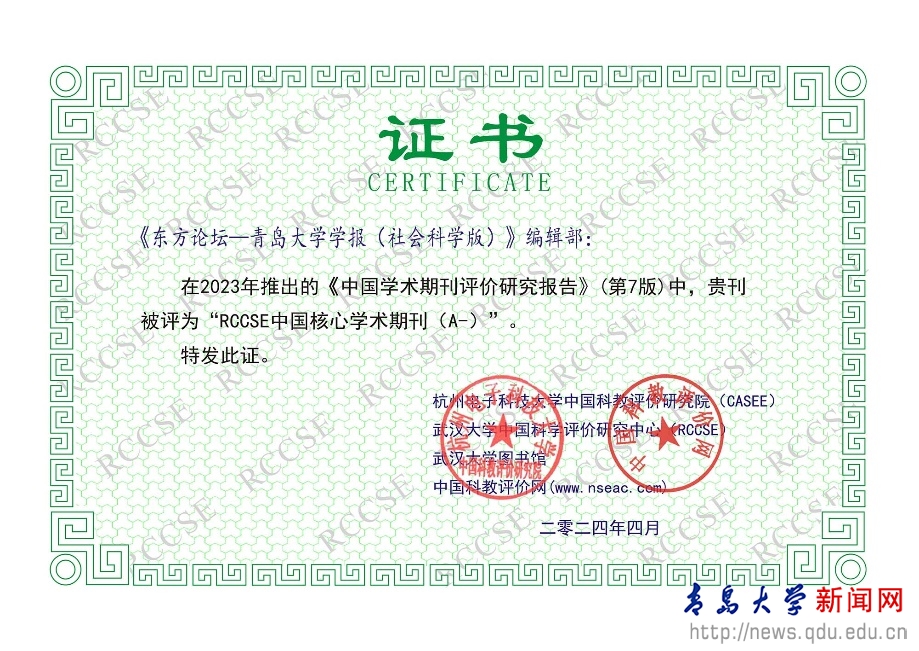 新闻网讯 近日,武汉大学中国科学评价研究中心(RCCSE)正式发布《中国学术期刊评价研究报告》(第7版),《东方论坛—YABO鸭脖学报(社会科学版)》首次被评为“RCCSE中国核心学术期刊(A-)”。