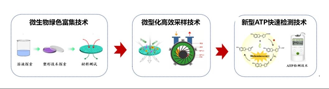 再次,解决了微生物快速定量检测的多个环节技术难题。研究团队通过探索解决了生物膜快速溶、高效洗脱、提取技术,实现了微生物样品最大限度的转移、收集能力。同时探索了相适应的ATP生物发光法,最终实现了捕获微生物的快速定量检测,检测时间缩短到传统方式的1/288。