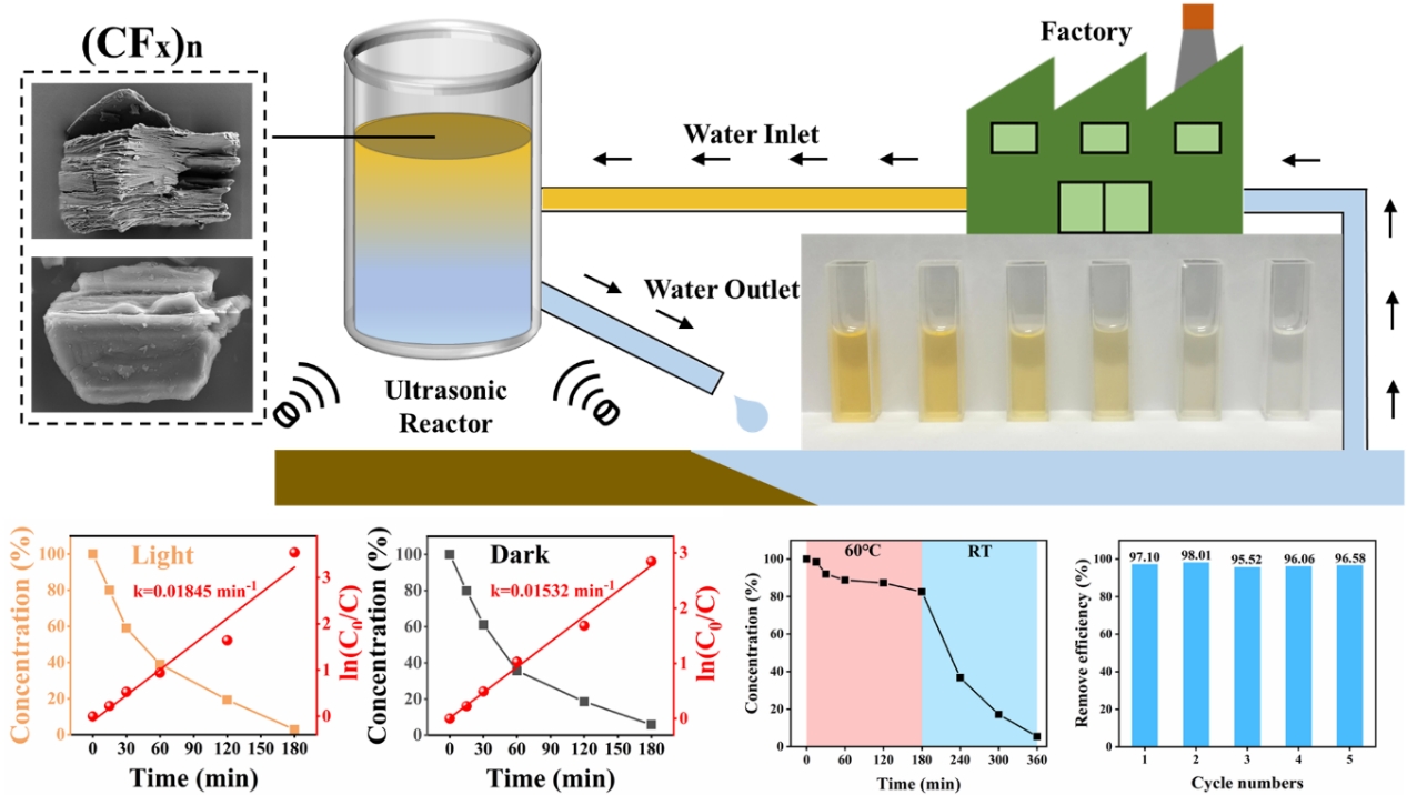 最近几年,接触电催化(CEC)作为一种有效的降解有机污染物的方法已经引起了人们的极大兴趣。然而,目前用于接触电催化的催化剂材料选择是有限的,且它们的有效性通常受到环境影响而导致催化性能下降。本工作提出了一种新型氟化石墨[(CFx)n]催化剂,拓宽了接触电催化剂材料的可用范围。研究表明二维氟化石墨催化剂即使在无光条件下仍保持较高的催化活性,且在高温条件下表现出良好的稳定性,大大优于传统的有机聚合物接触电催化剂(例如氟化乙烯丙烯共聚物FEP、聚四氟乙烯PTFE和聚偏氟乙烯PVDF)。此外,密度泛函理论DFT计算揭示了影响催化性能的关键因素。论文深入分析了温度对接触电催化效率的影响机制。经过多次接触电催化循环实验验证,氟化石墨粉末催化效率保持在95%以上,且可降解多种水中有机污染物(例如甲基橙、罗丹明B和结晶紫),展示出其在大规模有机污染物处理系统中的潜力。这些结果对于推动接触电催化技术在环境治理领域的应用具有重要意义,并为设计更高效、稳定的催化剂提供了有益参考。