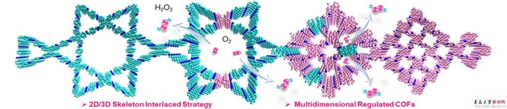 过氧化氢(H2O2)是一种清洁、无污染的化学能源,在水处理、能源技术、化学合成和造纸等方面具有广泛的应用。目前,用于H2O2生产的传统蒽醌氧化工艺存在高能耗和环境污染等问题,因此,氧还原反应(ORR)以其分布式小型化设备和绿色节能工艺的特点成为清洁H2O2可持续经济生产的一种有效手段。共价有机框架(COFs)材料具有组分可调、孔道结构高度有序、比表面积大、易于功能化修饰等优点,为开发功能性材料提供了强大的平台。此外,它们在框架表面丰富的活性位点和明确的晶体孔隙率在多相催化中表现出巨大的前景。众所周知,多组分COFs在物理化学功能方面比双组分体系中具有突出的优势,成为一种有效的调控策略。但目前多组分的报道主要集中在同一维度,而对于具有2D和3D单元交错的多组分COFs的拓扑控制少有研究。因此,仍然缺乏多维度和多组分协效调控的方法来开发高效非金属COFs基电催化剂。