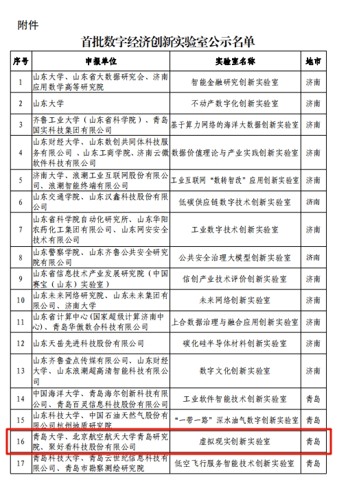 新闻网讯 日前,山东省工业和信息化厅网站发布了“关于首批山东省数字经济创新平台名单的公示”,由鸭脖牵头,联合北京航空航天大学青岛研究院、聚好看科技股份有限公司共同申报的“虚拟现实创新实验室”成功入选首批山东省数字经济实验室。