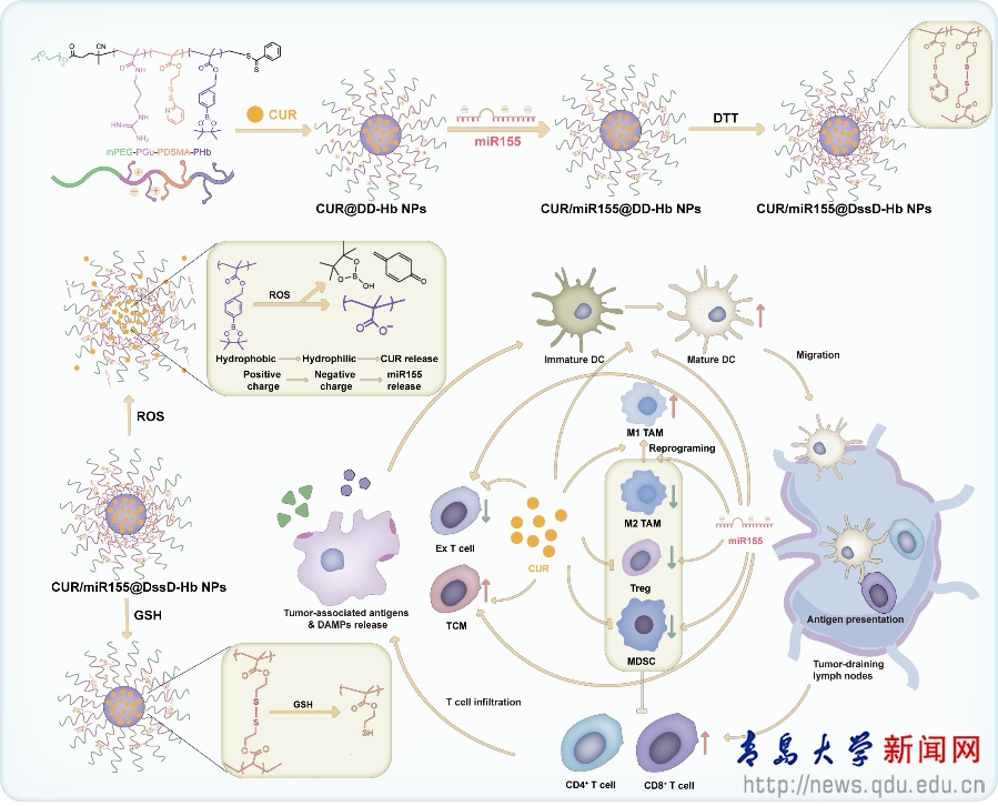 最近研究表明,miR-155可以促进M2型肿瘤相关巨噬细胞(TAM)向M1表型的极化,刺激DC细胞成熟并促进T细胞激活,但是miR-155会诱导调节性T细胞(Treg)和髓源性抑制细胞(MDSC)等免疫抑制细胞的募集。姜黄素(CUR)可以抑制Treg和 MDSC在肿瘤微环境中的募集并促进M2型TAM向M1表型的极化。因此,miR155联合CUR可以最大限度地减轻诱导的免疫抑制,从而增强抗肿瘤免疫反应。因此,设计了活性氧/谷胱甘肽双重响应药物递送系统(CUR/miR-155@DssD-Hb NPs)用于CUR和miR-155的共递送。体内外实验结果表明,CUR/miR-155@DssD-Hb NPs可有效抑制4T1和B16-F10肿瘤细胞活性,诱导损伤相关分子模式(DAMPs)的释放,刺激DC成熟,促进CD8+T细胞激活,减少免疫抑制细胞在肿瘤部位的募集(如MDSC、Treg和M2 TAM),促进长期免疫的形成并减少肺转移性结节的形成。总之,CUR和miR-155的共递送系统显示出用于黑色素瘤和三阴性乳腺癌免疫治疗的潜力。