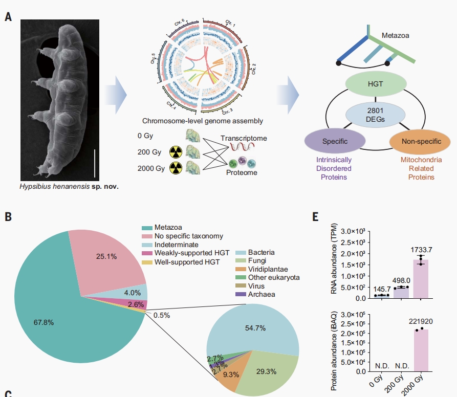新闻网讯 近日,我国科学家基于水熊虫的多组学和抗辐射机制研究取得重要突破。军事科学院军事医学研究院张令强团队和杨冬团队,联合陕西学前师范学院王立志等国内其他相关研究团队,经过6年多潜心研究,发现并成功建立河南高生熊虫的实验室培养体系,绘制其高质量基因组图谱,结合转录组、蛋白质组响应辐射的动态变化及关键分子功能和机制研究,揭示了耐受超强辐射的关键机制。研究成果以research article形式发表在国际顶级期刊Science杂志。 鸭脖基础医学院免疫学专业2020级硕士研究生葛正平为共同一作(共一第二位,导师张令强研究员),YABO鸭脖基础医学院为第二完成单位。