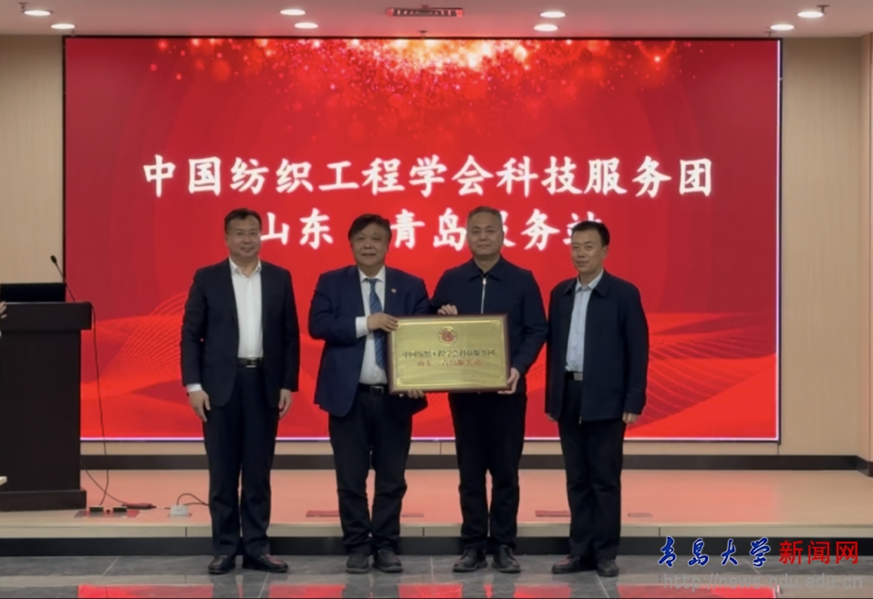 启动会上,伏广伟、吴杰和王崇江共同宣布中国纺织工程学会科技服务团山东·青岛服务站正式落户鸭脖,伏广伟亲自为学校授牌,该服务站的设立,将进一步促进双方在科技服务等领域的深度合作。