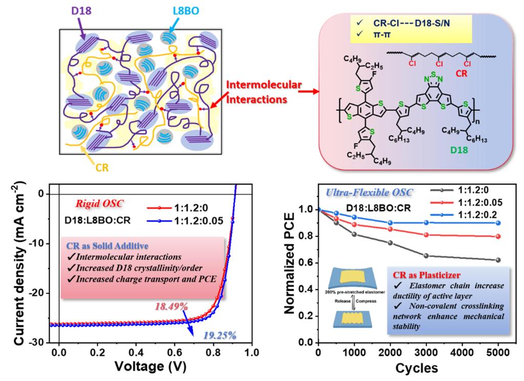 为了解决这一问题,研究团队将氯丁橡胶(CR)引入到活性层中。由于CR中卤素与双键的存在,CR与D18聚合物给体之间形成了分子间相互作用(包括卤素相互作用与π-π相互作用),这些相互作用增强了D18分子的堆积,并形成了一个互锁的三维网络,从而同时提高了器件的光伏性能(在少量添加下)与机械延展性。因而CR同时充当了固体添加剂和增塑剂的作用(图1)。基于本项策略,结合Parylene 作为超柔性基底,研究团队构筑了高效率超柔性有机太阳能电池(图2)。最终,基于此的刚性有机太阳能电池器件效率达到19.25%,超柔性器件效率达16.91%。活性层断裂应变从4.66%提升至22.86%。并且,器件的机械稳定性得到很大提高,在5000次压缩循环后仍保持89.9%的初始效率。