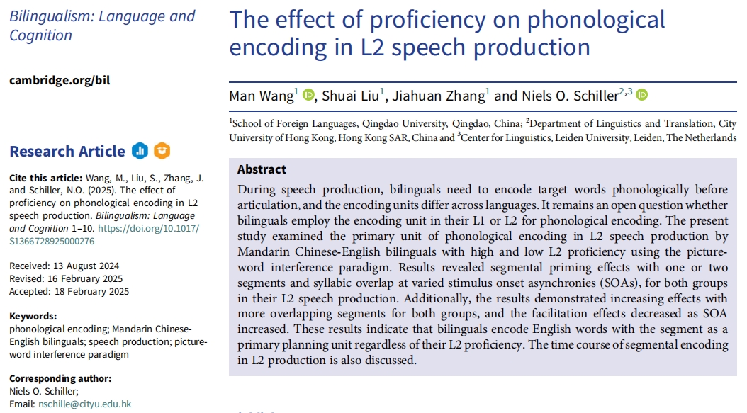 Bilingualism: Language and Cognition是双语研究领域公认的最好刊物之一,专注于双语现象的研究,近五年影响因子为3.8。王曼教授团队此次发表的题为The effect of proficiency on phonological encoding in L2 speech production的论文,采用图词干扰范式深入探讨了不同二语水平的汉英双语者在二语口语词汇产出时的音系编码计划单元,对理解双语者口语词汇产出时的跨语言差异具有重要意义。