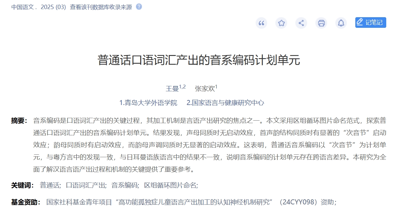 王曼教授团队此次发表的论文题为《普通话口语词汇产出的音系编码计划单元》。该研究采用区组循环图片命名范式,探索了普通话口语词汇产出的音系编码计划单元。研究表明,音系编码计划单元存在跨语言差异,普通话音系编码以次音节为计划单元,为全面了解汉语言语产出过程和机制的关键提供了重要参考。