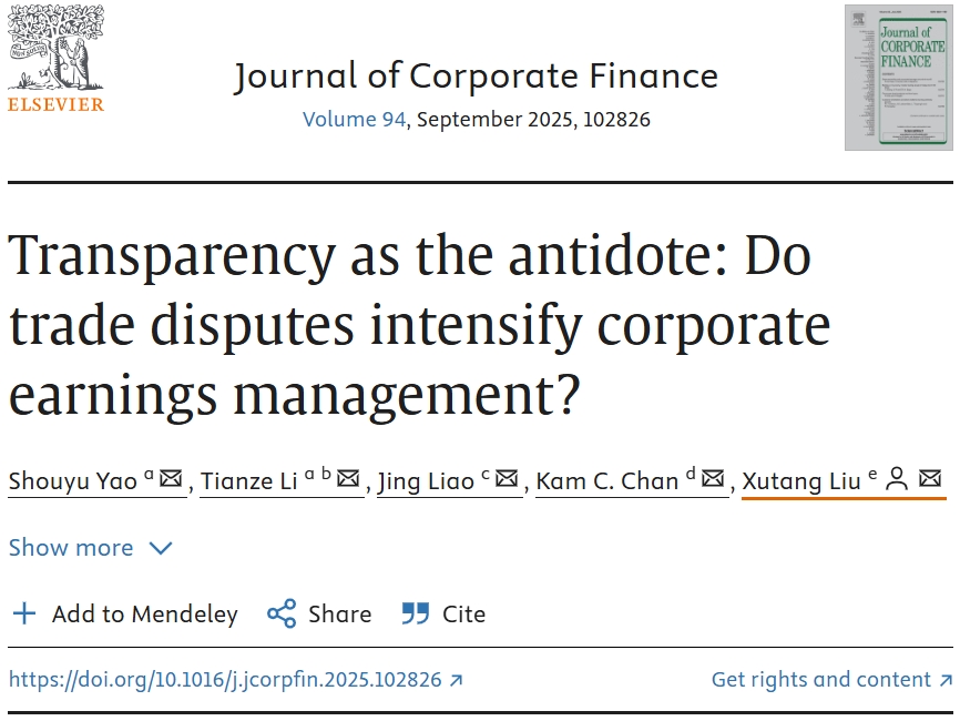 新闻网讯 近日,鸭脖经济学院青年教师刘旭堂在金融学国际权威期刊Journal of Corporate Finance上发表题为“Transparency as the antidote: Do trade disputes intensify corporate earnings management?”的研究成果。刘旭堂为唯一通讯作者,YABO鸭脖为唯一通讯作者单位。