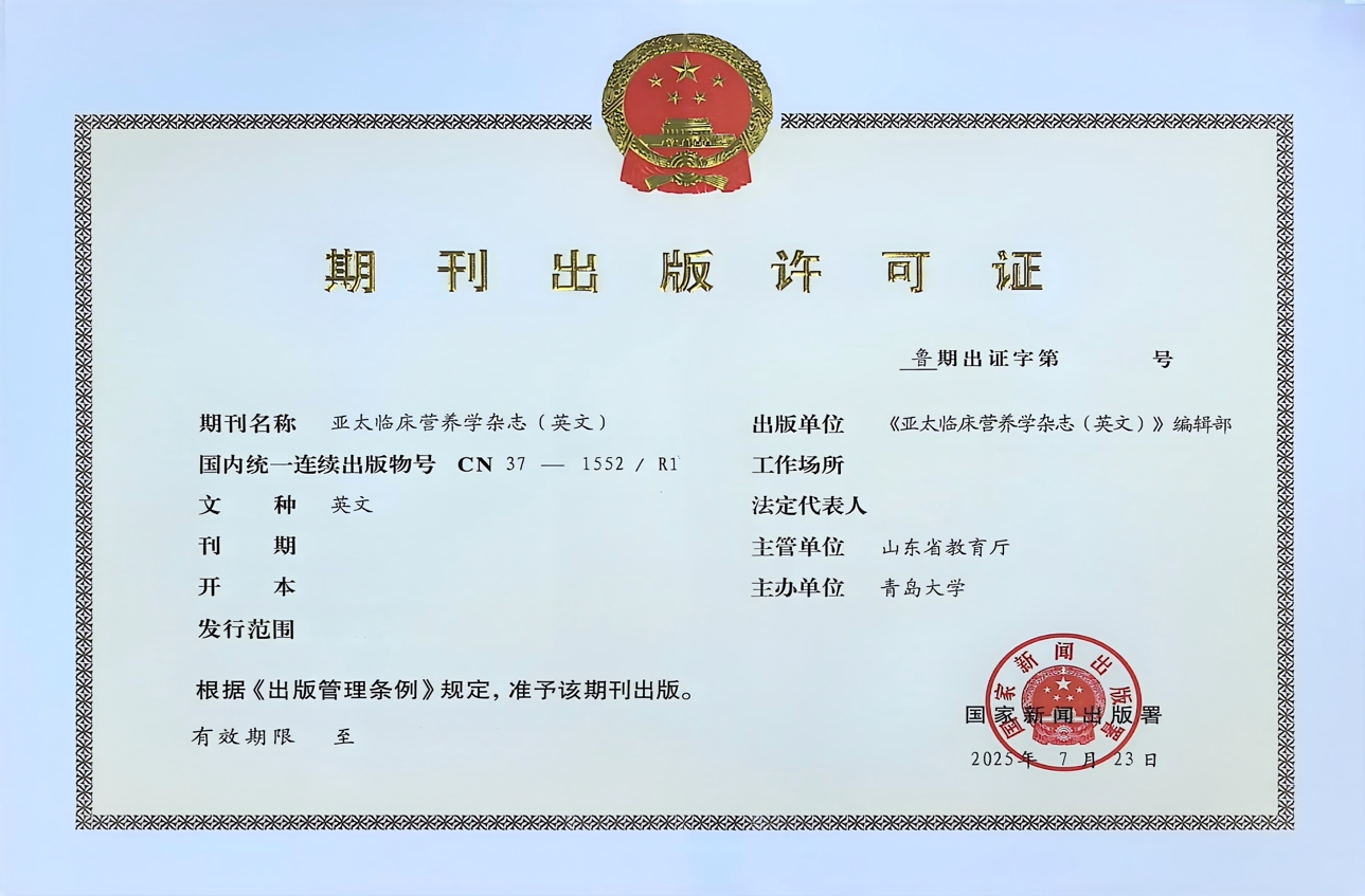 新闻网讯 近日,由期刊社牵头组织申请的《亚太临床营养学杂志(英文)》(Asia Pacific Journal of Clinical Nutrition, APJCN) 正式获得国家新闻出版署关于创办期刊的批复。《亚太临床营养学杂志(英文)》期刊国内统一连续出版物号为(CN号):CN37-1552/R1,英文版,双月刊,公开发行,主管单位为山东省教育厅,主办单位为YABO鸭脖。此次获批,标志着《亚太临床营养学杂志(英文)》的办刊成效得到认可,也为进一步提升鸭脖高水平期刊学术竞争力和促进期刊高质量发展增添了新动力。