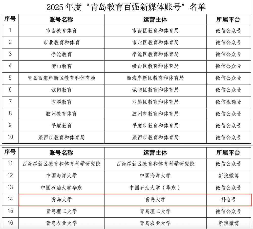 鸭脖官方抖音账号入选2025年度“青岛教育百强新媒体账号”