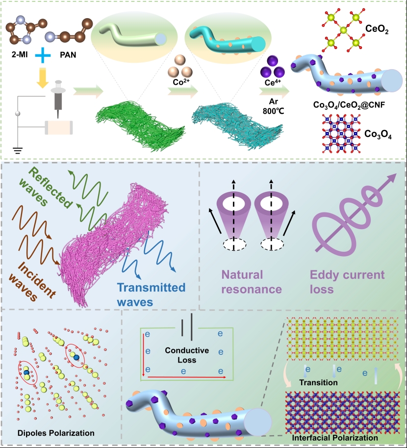 姜文豪同学作为第一作者的研究论文《Multi-scale Engineering of N-doped Carbon Nanofibers with Co3O4/CeO2Heterostructures: Tailoring Heterointerface Polarization for Microwave Absorption》发表于Carbon(IF=11.6,doi:10.1016/j.carbon.2025.120784.)。该研究聚焦电磁干扰调控,通过静电纺丝结合退火工艺,构建出MOF衍生的N掺杂碳纳米纤维嵌入Co3O4/CeO2异质结构的体系。研究利用稀土元素铈(Ce)独特的4f电子构型及Ce3+/Ce4+混合价态特性,协同高密度氧空位调控异质界面极化效应,所制备的材料在2.5 mm厚度下最小反射损耗(RLmin)达-55.29 dB,1.6 mm厚度时最大有效吸收带宽(EABmax)为5.04 GHz。