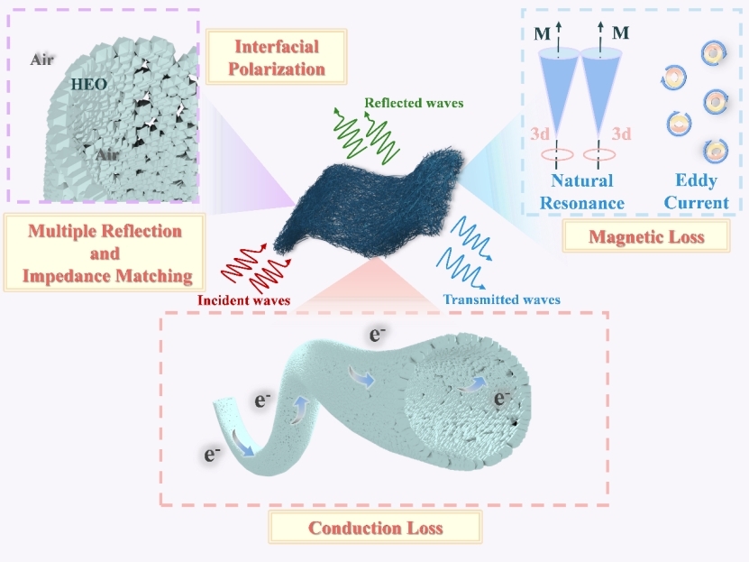 贾陈渝同学作为第一作者的研究论文《Hollow Porous High-Entropy Metal Oxides Enhanced Synergistic Loss with Excellent Electromagnetic Wave Absorption》发表于Composites Communications(IF=7.73,DOI: 10.1016/j.coco.2025.102569)。该研究针对高频电磁辐射相关问题,设计了基于高熵金属氧化物(HEOs)的空心多孔纤维结构体系,通过静电纺丝结合热分解技术,制备出涵盖尖晶石、钙钛矿、反尖晶石和立方结构的系列复合材料。利用高熵效应诱导的晶格畸变、氧空位及异质界面,增强界面极化与介电损耗。其中,尖晶石结构HEO在2.5 mm厚度下最小反射损耗(RLmin)达-56.08 dB,有效吸收带宽(EABmax)最大可达6.88GHz,展现出广阔的电磁防护应用前景。
