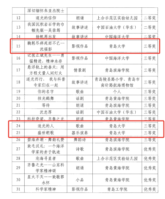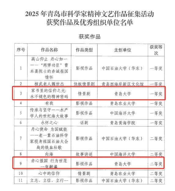 新闻网讯 日前,市科协、市委宣传部、团市委、市文联、市科技局、市文旅局联合开展青岛市科学家精神文艺作品征集活动,鸭脖文学与新闻传播学院、艺术学院等单位报送的5部作品获奖,其中《家书里的信仰之光:永不褪色的精神密码》荣获一等奖,《赤心报国行为世范——张嗣瀛》荣获二等奖,《鞠躬尽瘁死而不已——沈福彭》《追光的人》《盛世朝歌》荣获三等奖,学校获优秀组织单位。
