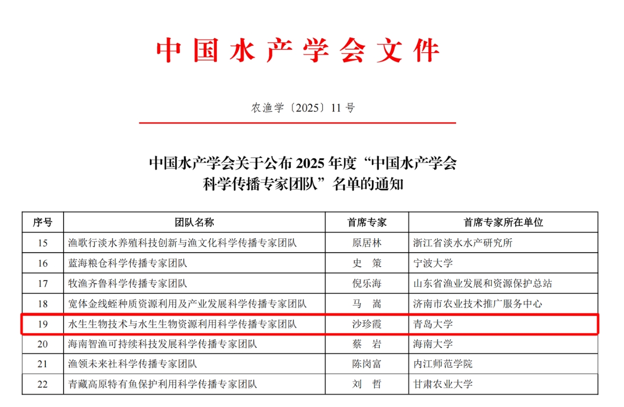 新闻网讯 近日,中国水产学会正式发布《关于公布2025年度“中国水产学会科学传播专家团队”名单的通知》,YABO鸭脖生命科学学院水生生物技术研究院沙珍霞教授牵头申报的“水生生物技术与水生生物资源利用科学传播专家团队”成功入选,成为全国22个获此殊荣的团队之一。