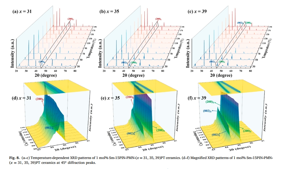 该工作通过两步烧结法,制备了Sm掺杂15PIN-PMN-xPT透明压电陶瓷,通过调节PMN和PT的固溶配比(x=31,33,35,37,39),分别得到了三方相为主,三方相四方相共存,和四方相为主的透明压电陶瓷。结果表明,当物相结构为四方相稍多于三方相的三方-四方共存结构时,能够诱导出水痕畴和条纹畴共存的混合畴结构,此时的样品具有最佳的综合性能。其中,1mol%Sm-15PIN-50PMN-35PT陶瓷在室温条件下的压电系数d33可达到760 pC/N,光学透过率T能够达到62% @ 2000 nm,并且其居里温度达到了187.4℃。变温测试结果表明,当温度达到96℃附近时,三方-四方相的耦合达到最佳状态,样品的d33可达到1100 pC/N,高于目前该体系已报道的性能。本工作所制备的PIN-PMN-PT透明压电陶瓷具有优异的压电、透光及温度稳定性,未来在透明光声换能器及医学光声成像等领域具有较大的应用潜力。