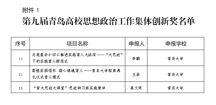 马克思主义学院赵俊林申报的《“大思政课”背景下高校思政课“三维立体”实践教学模式创新探索》、生命科学学院孙建华申报的《新时代大中小学思政暨生命科学育人共同体》、自动化学院于宏申报的《院士精神在高校学生“五育融合”中的思政引领作用机制与评价体系实践》获评青岛高校思想政治工作个人创新奖。