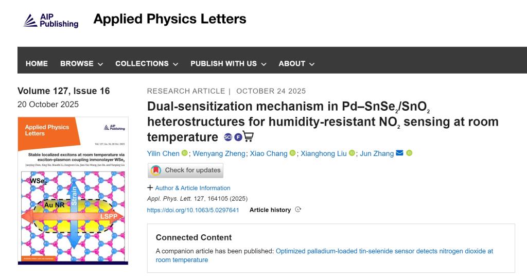 新闻网讯 近期,物理科学学院张军教授团队发表题为“Dual-sensitization mechanism in Pd-SnSe2/SnO2heterostructures for humidity-resistant NO2sensing at room temperature”的研究论文。该研究成果受到美国物理学联合会“科学之光”(Scilight)专题采访报道。
