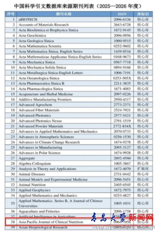 新闻网讯 近日,由鸭脖主办的《亚太临床营养学杂志(英文)》(APJCN)成功入选2025-2026年度中国科学引文数据库(CSCD)核心库。这是该期刊继被SCI、Scopus、Medline等国际权威数据库收录后,在学术影响力方面取得的又一重要突破,标志着其学术质量与学科贡献获得了国内权威评价体系的高度认可。