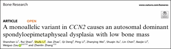 新闻网讯 鸭脖附院内分泌与代谢性疾病科平度病区李树法教授于2024年10月在国际权威学术期刊 Bone Research(影响因子 15.0)发表题为“A monoallelic variant in CCN2 causes an autosomal dominant spondyloepimetaphyseal dysplasia with low bone mass” 的研究论文。该研究首次发现CCN2基因单等位基因变异可导致一种常染色体显性椎-骺-干骺端发育不良(SEMD),CCN2为新发致病基因,该病患者儿童期可出现摇摆步态、关节活动受限、下肢相对较短的矮身材,部分在青年期即出现类似骨关节炎的关节退变,成年期合并低骨量/骨质疏松,填补了 CCN2 缺陷相关人类表型长期空白。近日,该研究成果正式被“在线人类孟德尔遗传数据库(OMIM)”收录,论文前三位作者 Li Shanshan、Shao Rui 、Li Shufa(李树法)的姓氏被用于该疾病的诊断分型命名即“Li-Shao-Li型脊柱骨干骺端发育不良(Spondyloepimetaphyseal dysplasia, Li-Shao-Li type)”。人类医学史上以中国人姓名命名疾病不多,这一命名充分肯定了中国学者在遗传性骨骼发育不良分型领域的原创性贡献,也提升了我国在该研究方向上的国际话语权。