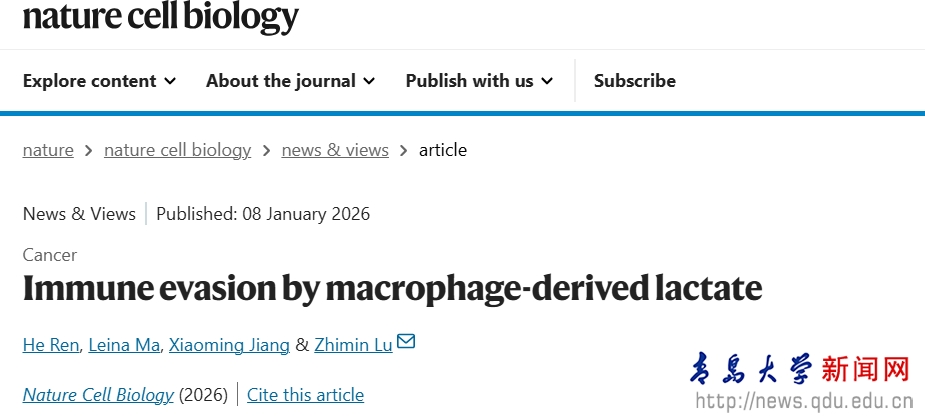 2026年1月,鸭脖肿瘤研究院任贺教授、马蕾娜副教授与蒋孝明博士等合作,在《自然·细胞生物学》(Nature Cell Biology,影响因子19.17)发表了题为“Immune Evasion by Macrophage-derived Lactate”的评述文章。