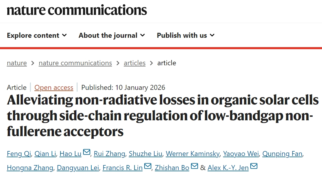 新闻网讯 近日,材料科学与工程学院齐峰副教授、路皓副教授与纺织服装学院薄志山教授,在抑制有机太阳能电池非辐射能量损失的研究领域取得了重大突破性进展,相关成果以“Alleviating non-radiative losses in organic solar cells through side-chain regulation of low-bandgap non-fullerene acceptors”为题在国际顶级学术期刊Nature Communications上发表。YABO鸭脖为第一单位和通讯单位。