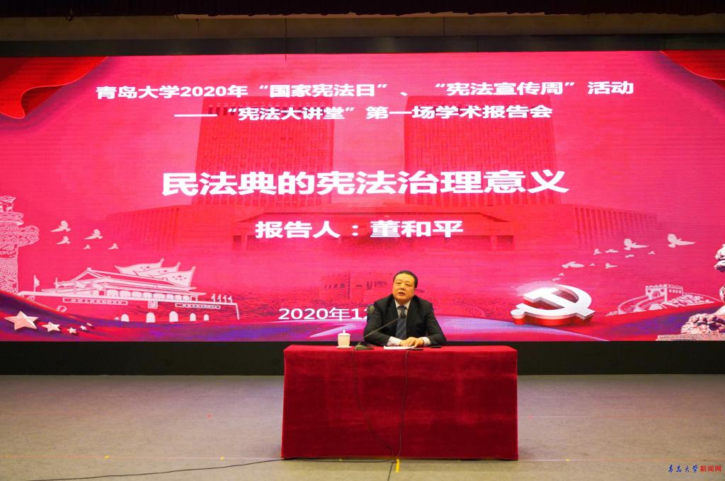 新闻网讯 按照学校2020年“国家宪法日”、“宪法宣传周”活动安排,12月4日下午,“宪法大讲堂”第一场学术报告会在国际学术交流中心博学厅举办,报告会由学校特聘教授董和平主讲,题为《民法典的宪法治理意义》。校党委常委、宣传部部长吴世珍主持报告会。