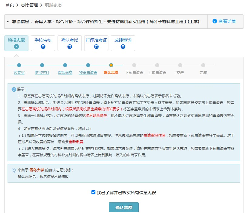 点击“确认志愿”后,确认志愿成功,点击“下载申请表”,然后点击“下一步”,输入申请表的版本号“001”进行保存