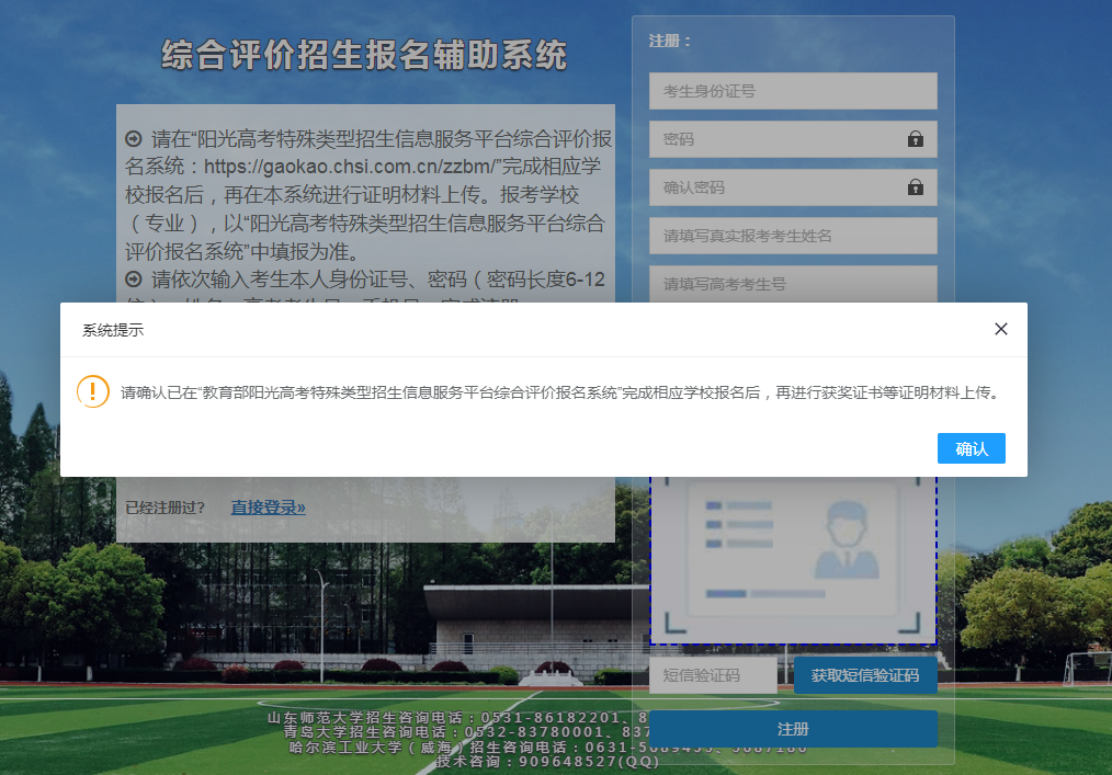 (一)系统网址:/index.html,打开网址后点击“注册”,注册前请确认已在教育部阳光高考特殊类型招生信息服务平台综合评价报名系统完成报名,点击“确认”。