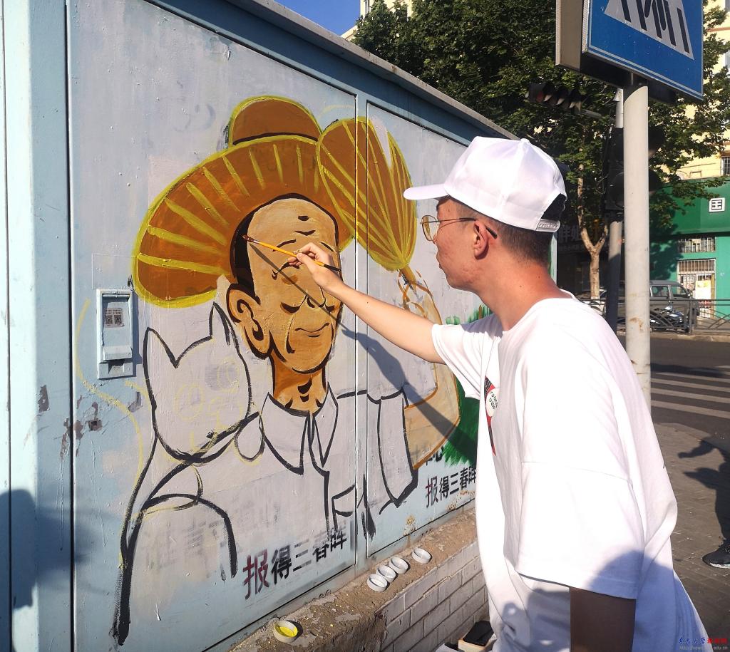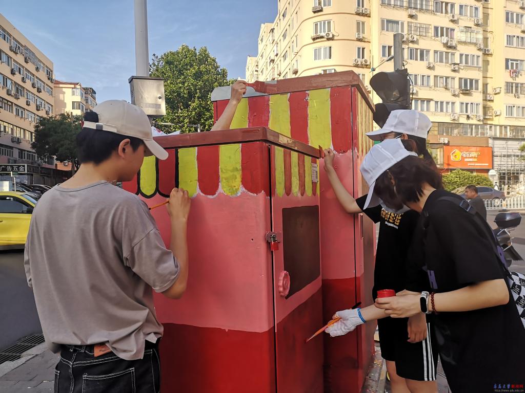 新闻网讯 近日,计算机科学技术学院数字媒体专业学生受大港街道新时代文明实践所邀请,以“迎接建党一百周年”“文明出行”“节约粮食”等为主题,为长春路、华阳路周边配电箱绘制彩色“新衣”,助力全国文明典范城市和国家卫生城市创建。