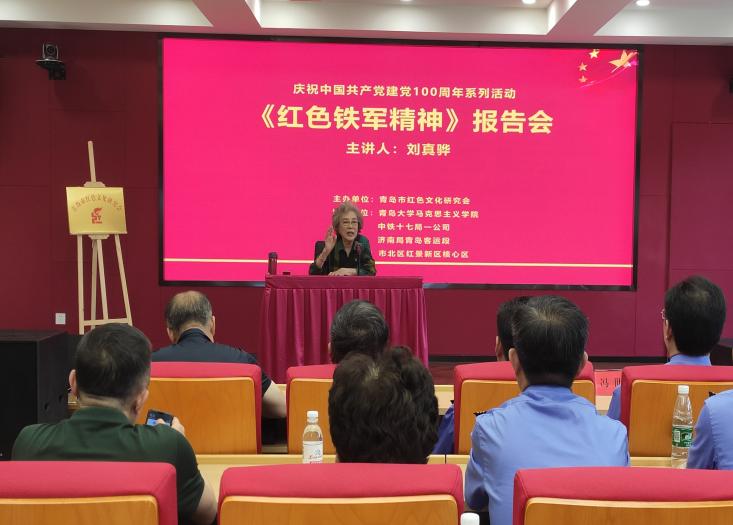 随后,铁道游击队作者刘知侠遗孀、青岛市红色文化研究会艺术顾问刘真骅作《红色铁军精神》报告。刘真骅深情讲述了刘知侠创作《铁道游击队》所蕴含的红色铁军精神以及自己坚持与病魔抗争,完成刘知侠遗愿的感人故事。刘知侠自1938年参加革命以来,一手持笔一手持枪战斗在最前线,冒着敌人的枪林弹雨,创作了著名的军事题材红色小说《铁道游击队》、《红嫂》等家喻户晓的作品弘扬红色文化,他一生都以忠诚和热血诠释着共产党员的党性。整个报告会历时两个多小时,刘真骅的讲述娓娓道来,情真意切,动情处热泪盈眶,现场观众也几次满含热泪,为刘知侠创作红色作品呕心沥血,一片忠心震撼;为刘真骅与丈夫深厚的革命感情和为实现丈夫遗愿而付出的艰辛和心血动容。