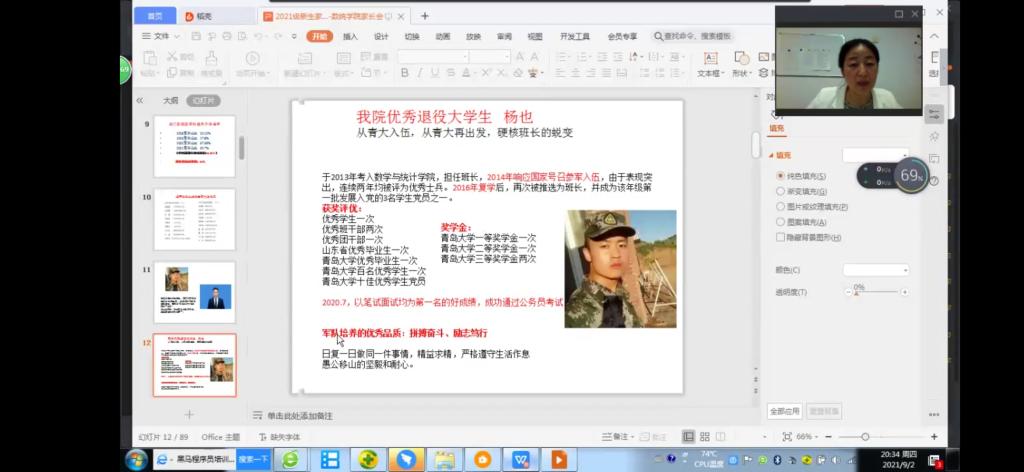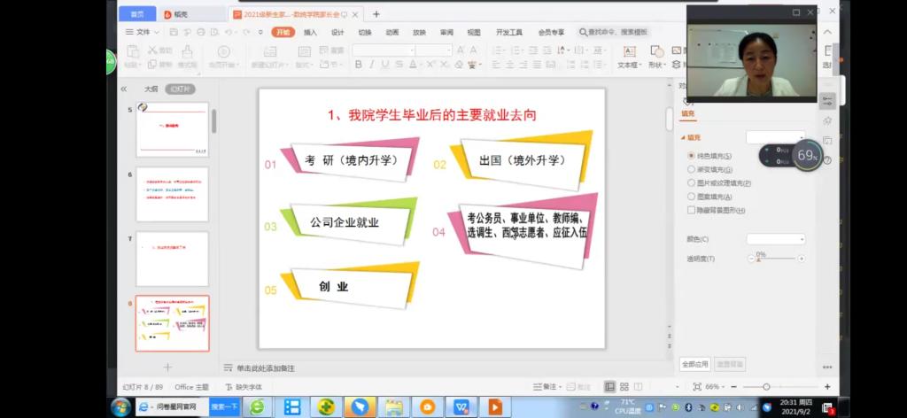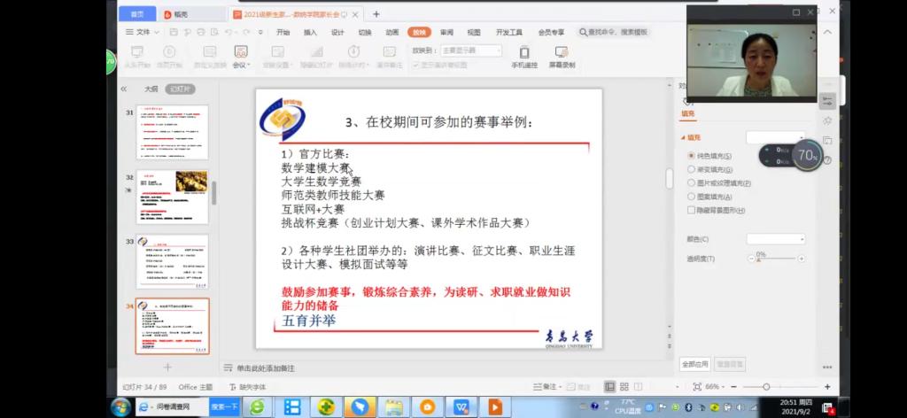 之后,张雪蕾从就业方向、学生培养质量、如果度过大学生活、常见心理问题、安全防范、疫情防控要求、军训要求、宿舍内务等八个方面向新生及家长做了综述,让家长们对大学管理模式有了进一步的认识。她建议新生家长们加强对学生学业水平的关注,努力培养学生时间管理能力、人际交往能力,希望新生家长及时与学生沟通,积极鼓励、培养自己的孩子成为勇于担当的数统学子!