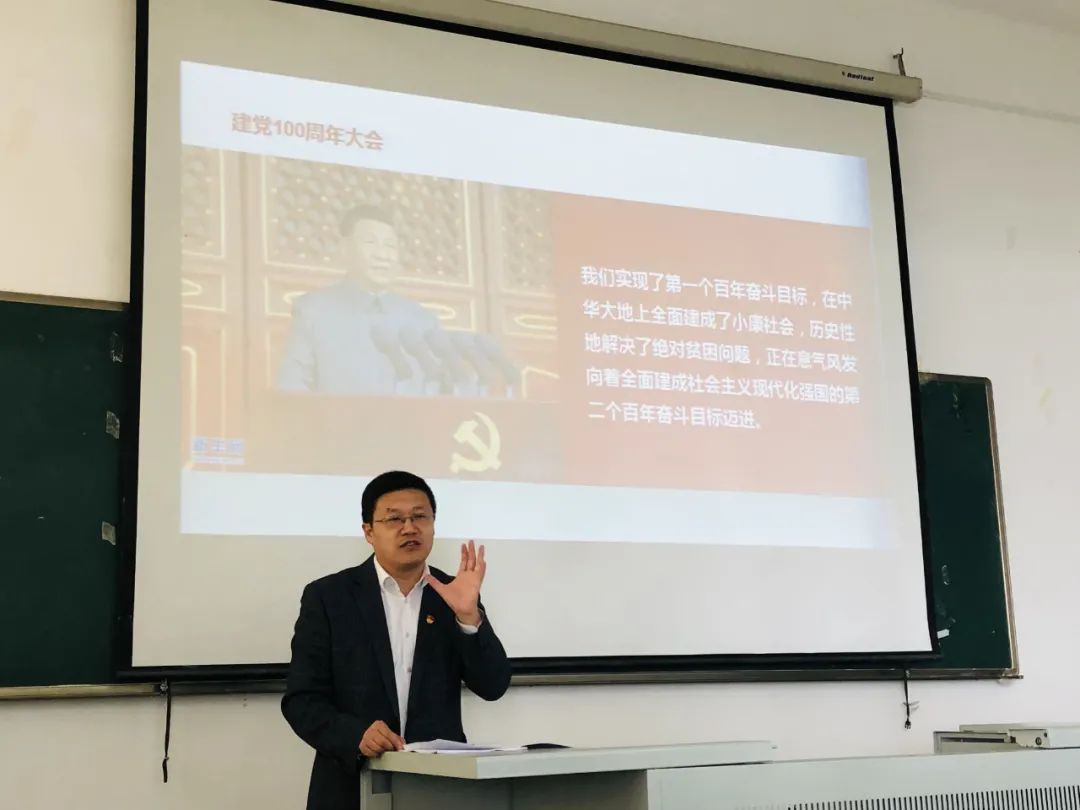 仪式上,校团委书记马林刚为学员讲述了主题为《请党放心 强国有我》的主题团课,他以习近平总书记“七一”重要讲话精神为核心,向同学们介绍了中国共产党从初成立时的筚路蓝缕,到不断发展壮大时面对的无数艰辛和艰苦奋斗,再到新时代中国共产党不忘初心,不负时代和人民赋予的历史使命。他结合个人的生活和工作经验,用自己对于中国发展和中国共产党坚强意志的深刻理解,带领同学们对“七一”建党精神的深入解读。最后,他号召在座的同学们要以实现中华民族伟大复兴为己任,增强做中国人的志气、骨气、底气,不负时代,不负韶华,不负党和人民的殷切期望!