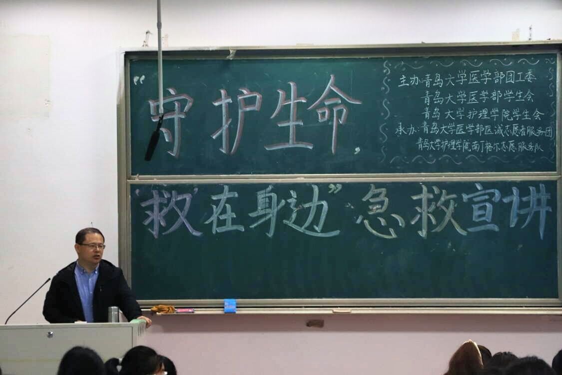 护理学院成人护理学教研室主任韩晶作为主讲人在博文楼217阶梯教室进行了急救知识宣讲。附属医院院长助理、护理部主任魏丽丽以及急诊科专家钟政、邱娇艳、王琦琛、潘婷婷、杨海朋等老师作为指导老师带大家进行实操。