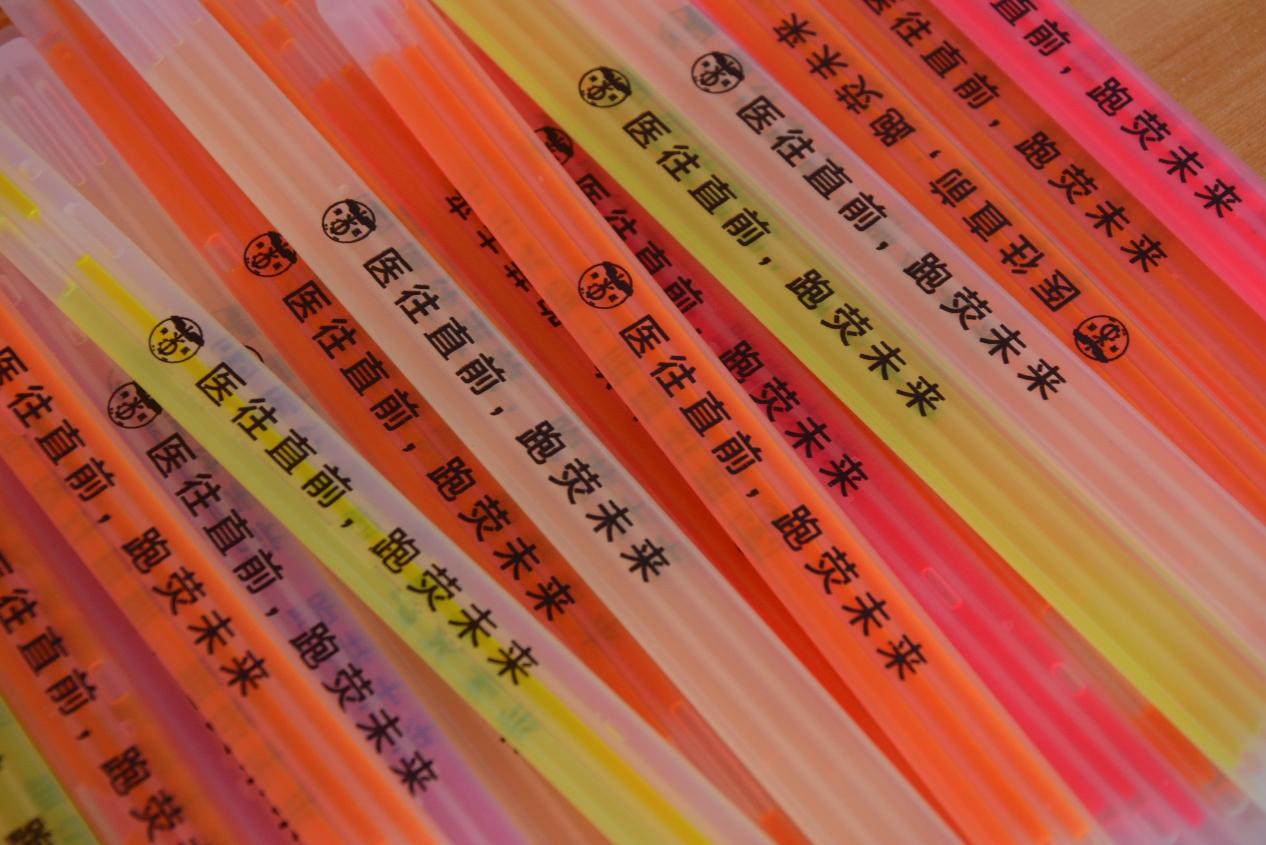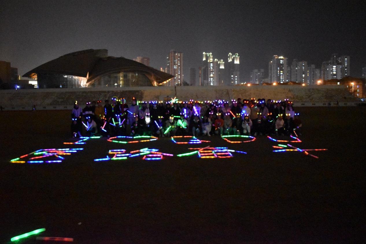活动当天,工作人员给学生发放荧光棒,并提前摆好“请党放心 强国有我”“I❤QDU”“医梦为马 考研加油”等字样。雨后的微风虽带着凉意,却难掩大家的积极与热情,随着开跑指令发出,200余名参与学生相携出发,夜幕中的操场荧光闪耀,奔跑的人群在跑道上形成了亮丽的风景线。