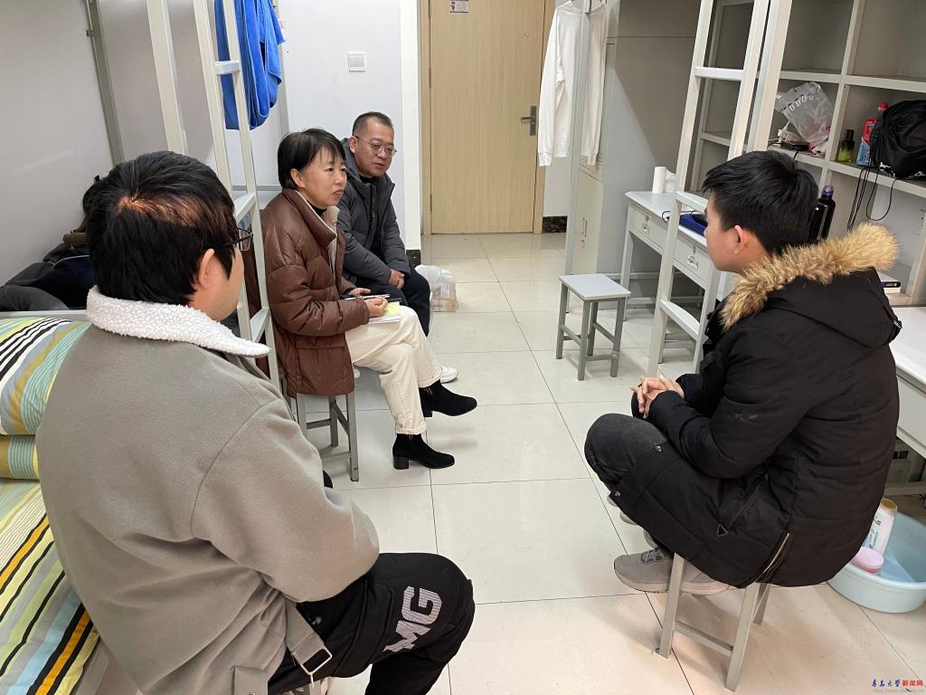 在学生宿舍,牟晓燕、张博与留校学生进行了亲切的交谈,耐心询问学生在校期间学习、生活中存在的困难和需求。牟晓燕在和同学们的交谈中叮嘱大家:一要严格按照家乡和学校疫情防控相关管理规定,自觉配合做好防疫工作,注意个人防护和自身安全;二是结合个人实际,合理安排在校的学习和生活,认真做好求职规划与考研复试的准备工作,加强体育锻炼,注重劳逸结合;三是保持通信畅通,主动加强与家长、亲人联系,遇到困难在第一时间向辅导员老师反映,让父母与老师安心。