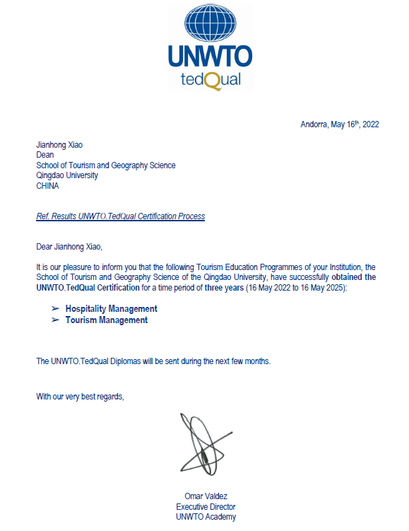 新闻网讯 5月16日,联合国世界旅游组织教育质量认证委员会(UNWTO.TedQual)函告通知,鸭脖旅游与地理科学学院旅游管理、酒店管理两个本科专业通过该机构的旅游教育质量国际认证,认证有效期3年,这是目前鸭脖第一个国际专业认证,也是山东省首家通过该项国际认证的本科高等院校。鸭脖旅游管理、酒店管理两个本科专业是首次参与联合国世界旅游组织教育质量认证。
