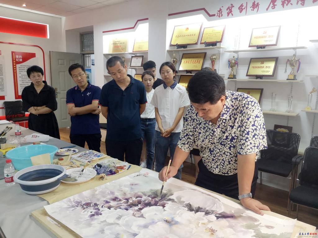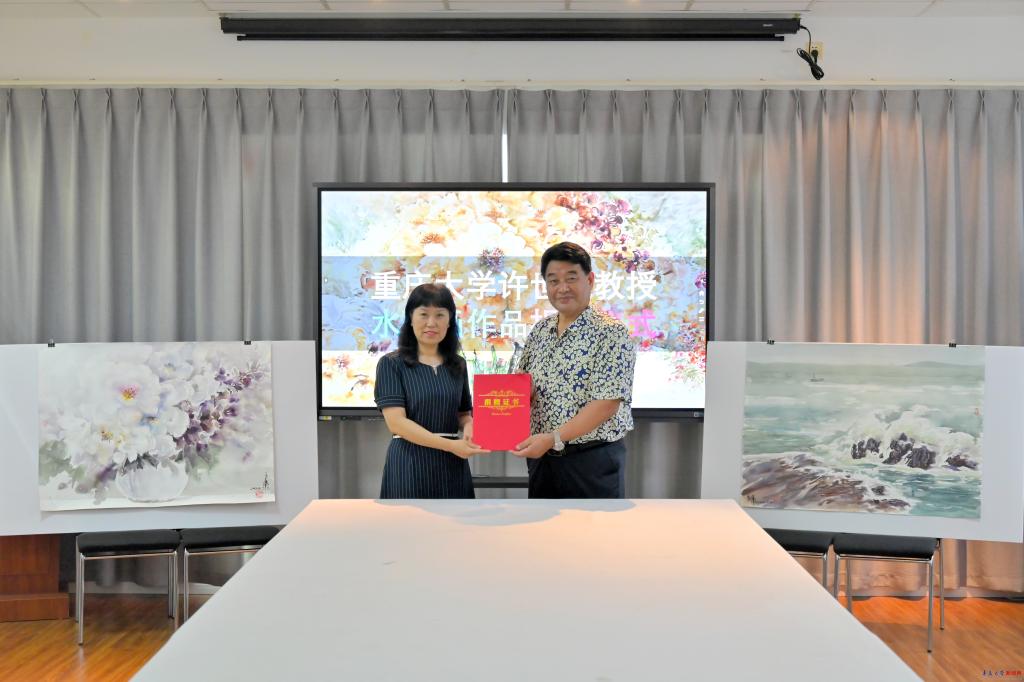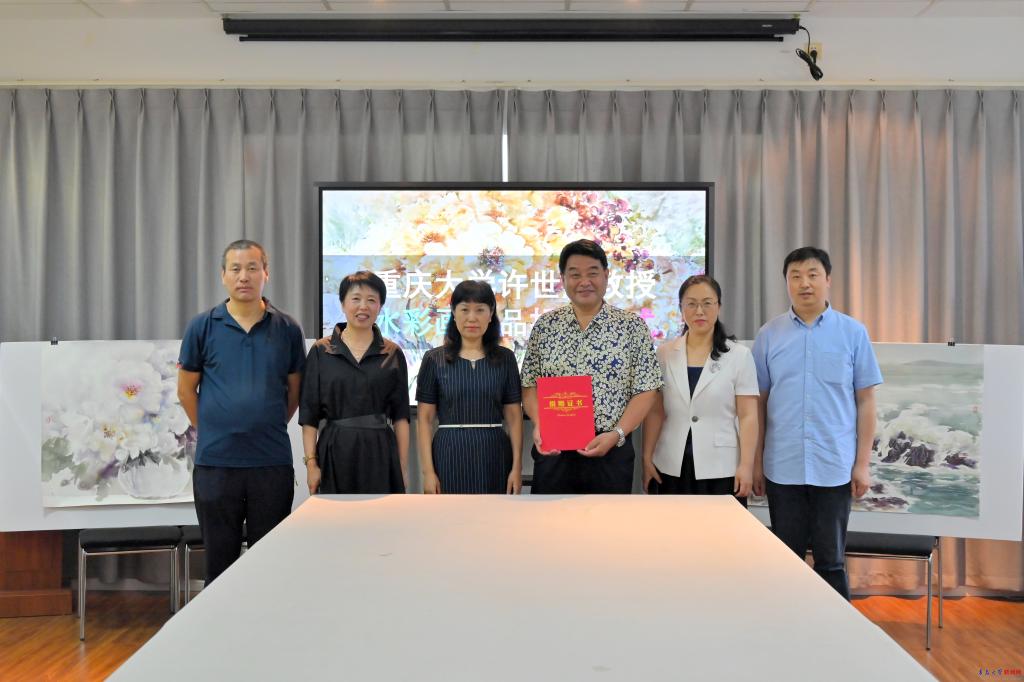新闻网讯 7月4日下午,应机电工程学院邀请,中国当代艺术名家重庆大学艺术学院许世虎教授在浮山校区诚思楼211会议室向师生们进行水彩画示范,通过现场创作让师生们充分感受水彩之美。许世虎教授将现场创作的两幅水彩画作品《涛声》和《盛开》作为庆祝YABO鸭脖合并办学30周年的礼物捐赠给学校收藏。校党委常委、副校长刘彩云出席捐赠仪式并代表学校为许世虎教授颁发了捐赠证书。