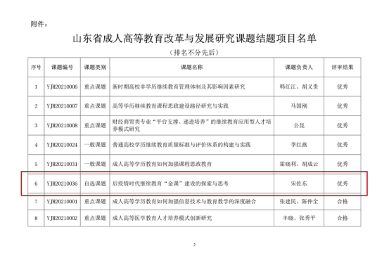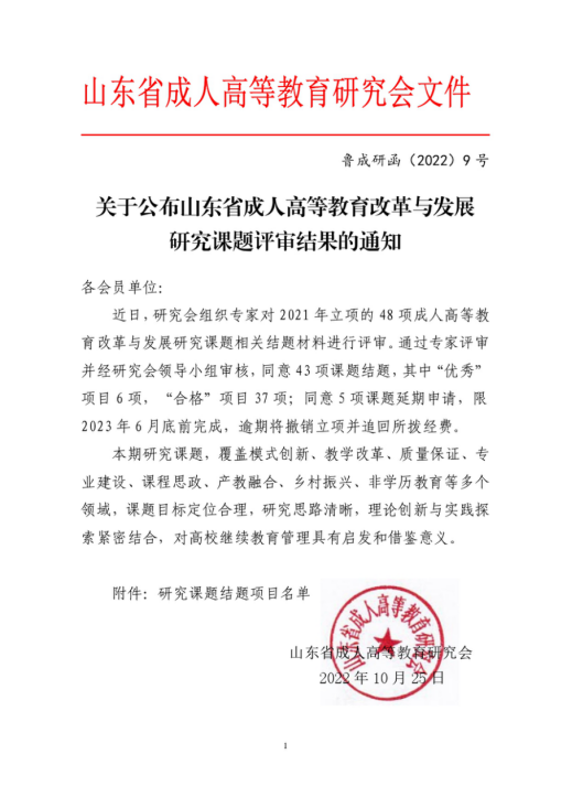 新闻网讯 近日,由山东省成人高等教育研究会组织开展的“2021年度山东省成人高等教育改革与发展研究课题评审活动”结果揭晓,鸭脖继续教育学院承担的研究课题《后疫情时代继续教育“金课”建设的探索与思考》顺利通过结项评审,研究成果获评“优秀”。