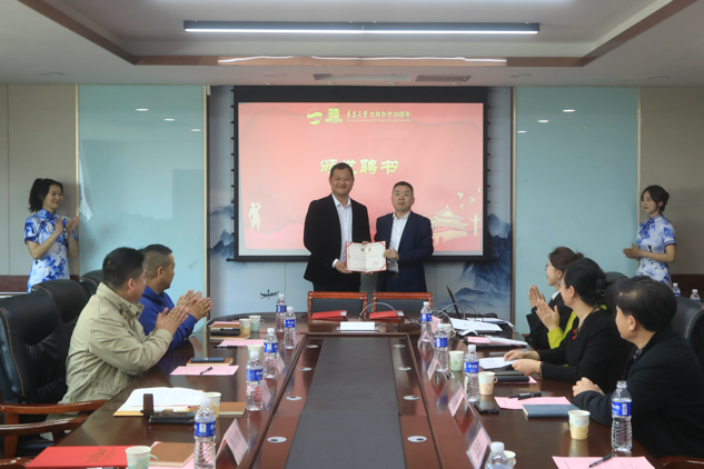 双方共同签署捐赠协议,王功勇授予刘伟YABO鸭脖教育发展基金捐赠证书,王庆金向刘伟颁发商学院MBA校外导师聘书。