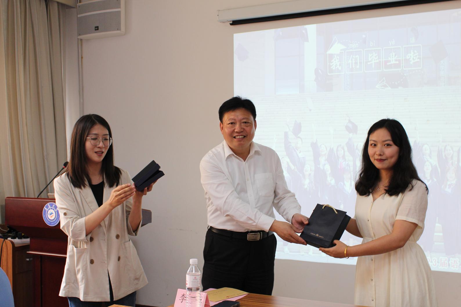 班会最后,英语(语言大数据)创新实验班学生代表李俣霏将凝结班级四年成长与对母校感恩之情的《致母校的一封信》交予母校,陈涛代表学校向同学们赠送了代表着鸭脖文化和鸭脖精神的文创产品。